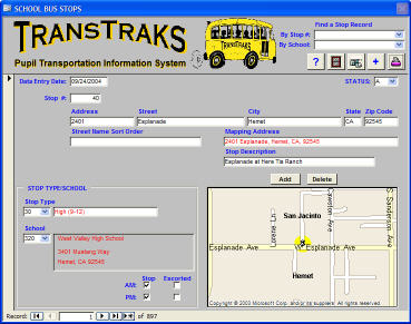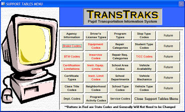 TransTraks is a program written in Microsoft Access, which is an industry standard relational data base management system (DBMS). Therefore, its data base structure can be easily modified and expanded to meet future needs and requirements. It also resides in the Microsoft Windows environment, resulting in a friendly graphical user interface (GUI) that is easy to work with. New staff members can be up and running very quickly when compared to other pupil transportation information systems that often require weeks or months of training. Staff can become productive in TransTraks after just a few short hours of training. |