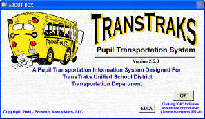 TransTraks is a new kind of software designed for the school transportation industry. Easy to learn. Simple to use. Powerful tools. Yet, affordable for all size school transportation operations. Using the point and click simplicity of Windows and the power of Microsoft Access, you are now in control of all of your transportation data. TransTraks was developed by and for transportation management professionals. Unlike many other programs on the market today, TransTraks was developed with input from a group of small, medium and large beta school districts. The result is a comprehensive software package for one affordable and reasonable price. TransTraks includes the following comprehensive modules: · Student Database · Vehicle Maintenance (including Work Orders) · Computerized Training Records · Field and Athletic Trips · Employee Timekeeping · Computerized Routing and Mapping · Multi-user and Networkable · Student Bus Pass System (including Parent Pay) |